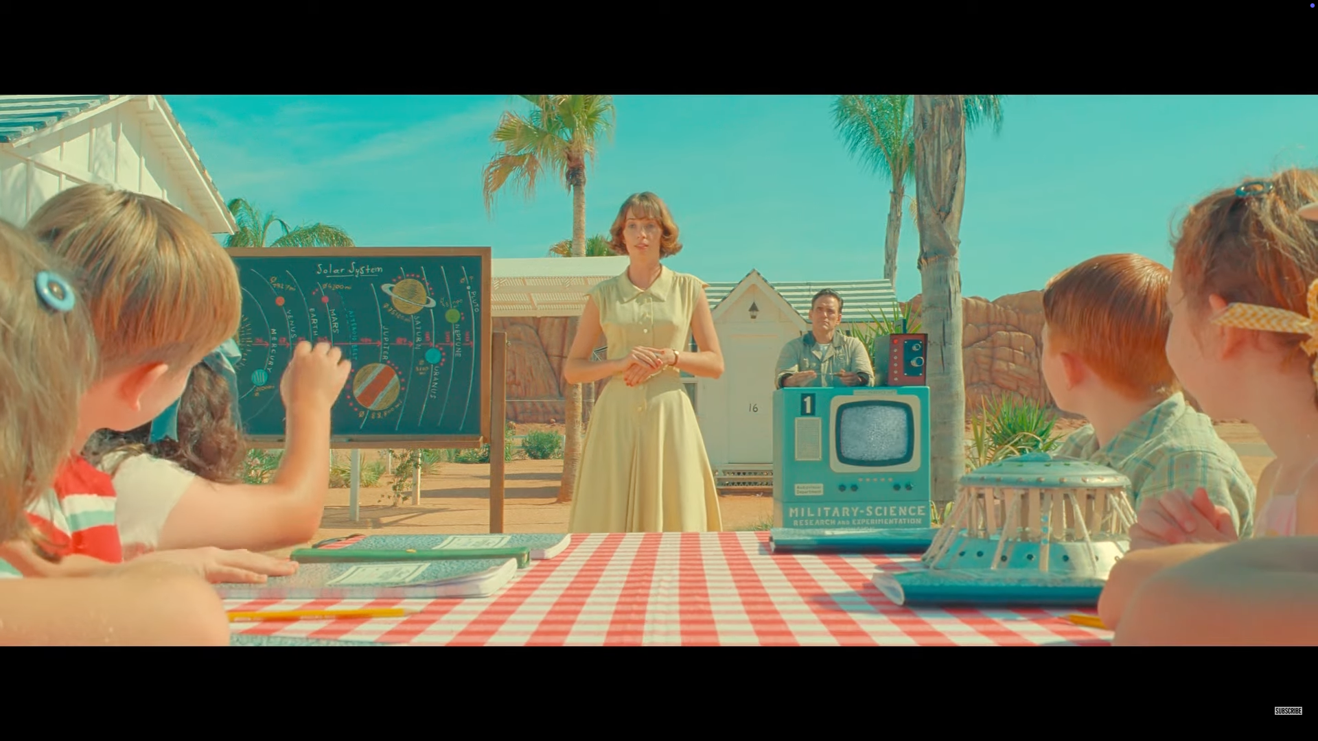 In this specific scene, June is talking to a group of students who are in asteroid city with their families. You can see throughout the entire clip these center compositions and symmetrical scenes. These compositions allow the subject to be framed by the rest of the scene in this case. It is also important to not Anderson’s distinct use of color in the scene, which helps to create an old-school filmic vibe to the movie.
